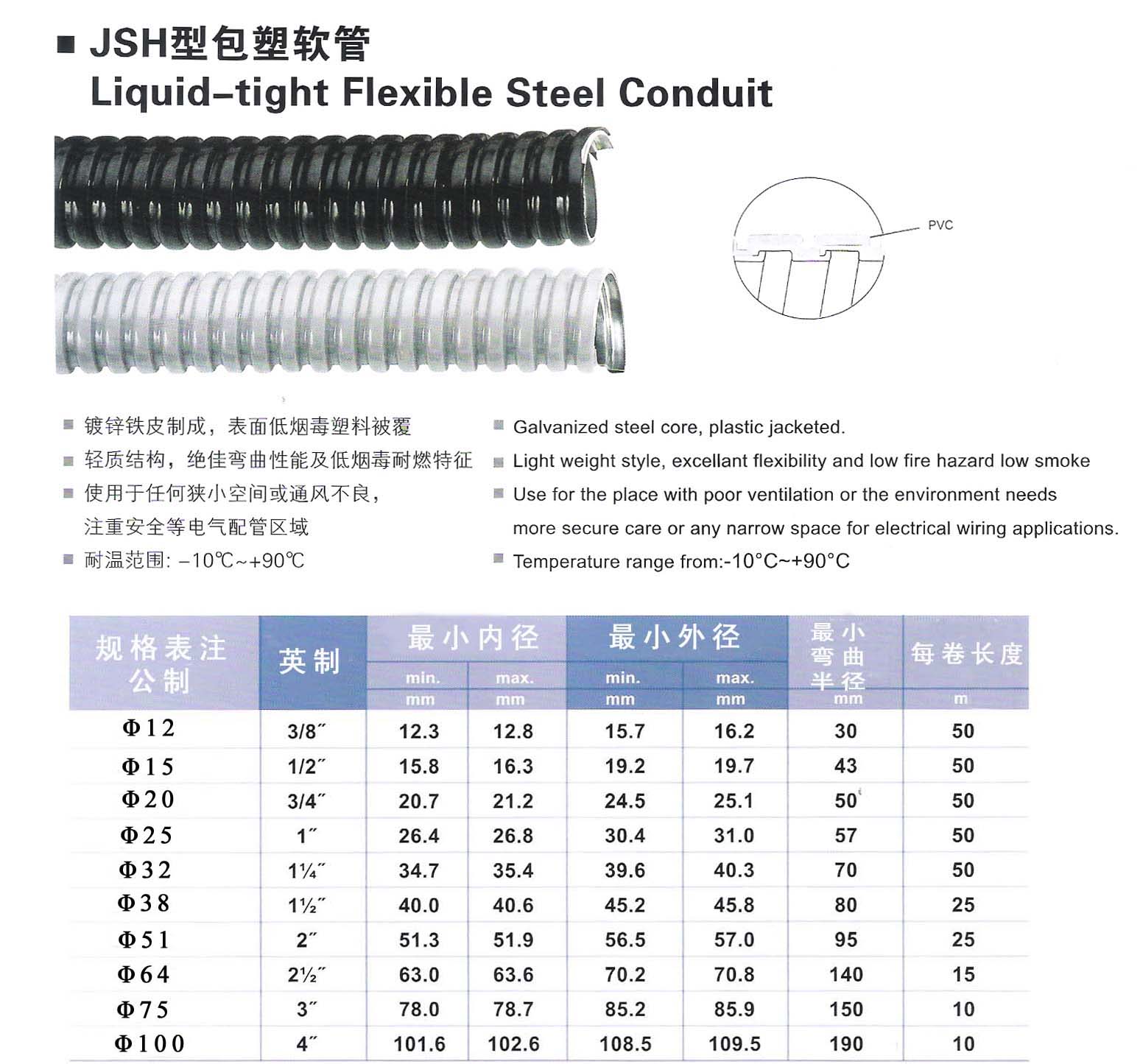 JMF-JSH标准包塑金属软管,俗称蛇皮管,内层软管为兴化市佳敏金属软管厂第一轧钢厂生产的冷轧钢带,光亮平滑处理,无毛刺;沿着管壁芯的凹凸面贴紧地包覆的外层为阻燃高级PVC电缆料粒子,吸附性强,阻燃防火,光亮鲜艳。其主要为自动化仪表信号线、电缆电线提供保护外套,亦作为电子设备线路保护管,电器线路的安全防护管。为电力信号线,控制线,光缆线路等线路外提供绝缘保护,并可起到美观的作用。