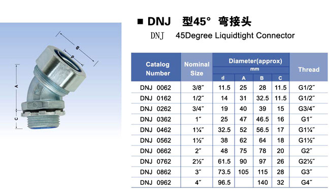 DNJ45度弯头金属接头为端接式,用来将金属软管45度连接于箱体连接件上;
